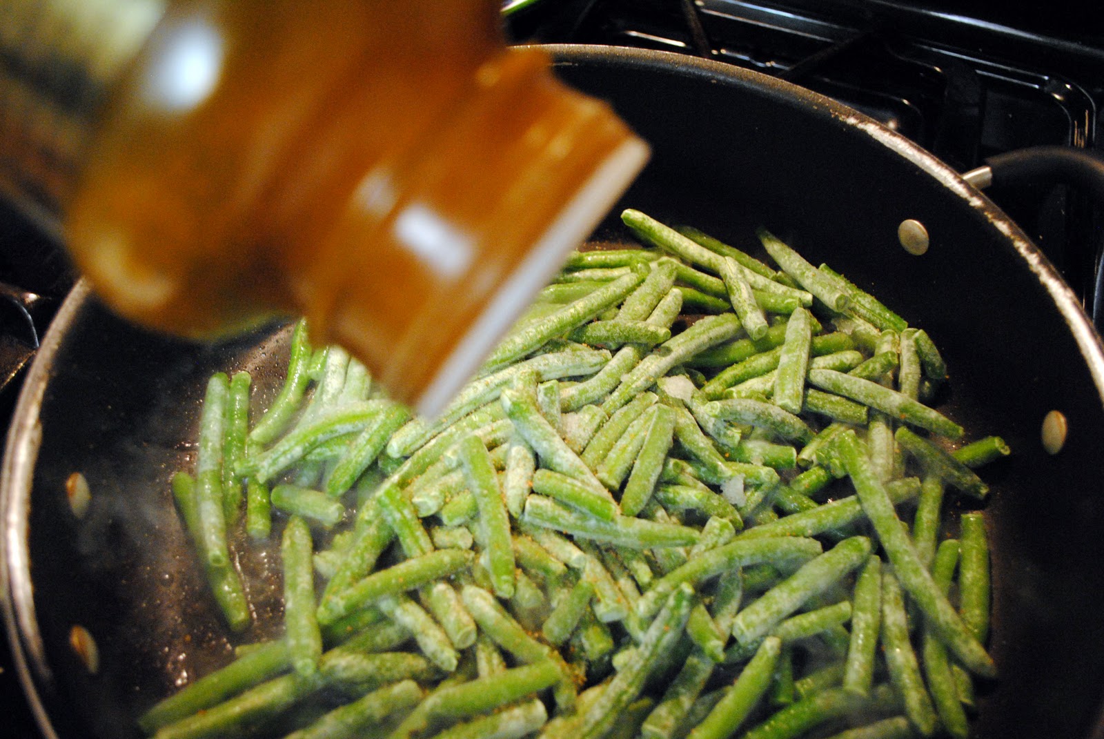 Stir fry the beans until they are hot and some of them get a slight brownish char on them, but are still bright green. (slight, not blackened–slight, very, very slight). If you are not adept at slight, then don’t do it at all. Just cook the beans until they are done, but still have a bright green color. Do NOT cook them until they turn olive green and are mushy. It’s just not right to do that to green vegetables.